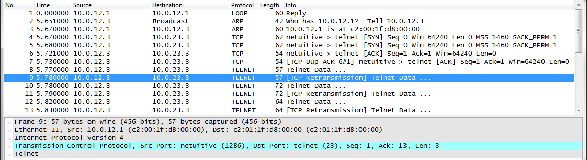 Wireshark interprets these duplicate packets as retransmissions. We could see that each packet from H1 to Server is displayed 2 times. The first packet is from H1 to Server which arrives at R1, the second one is the packet which R1 routes out of the same interface towards R2.