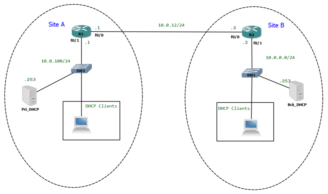 If the DHCP server (Pri_DHCP) at Site A fails, the clients must get IP address from DHCP server (Bck_DHCP) at Site B. The backup DHCP must only be used in case the primary fails.