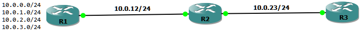 R1 has a default route towards R2. R2 and R3 has a summary route for 10.0.0.0/22 towards R1. R3 has also a route to 10.0.12.0/24 pointing to R2.